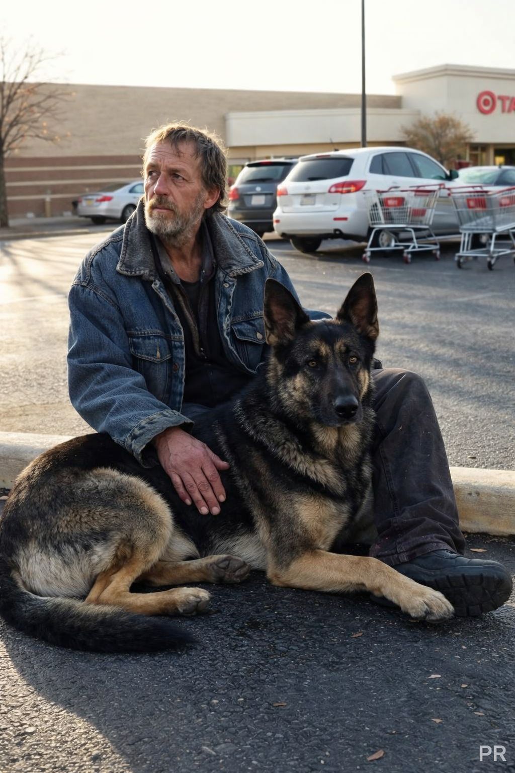 As I walked out, I saw him — sitting on the curb with his dog, a big German shepherd curled up beside him. He looked exhausted… not just tired, but worn down by life.